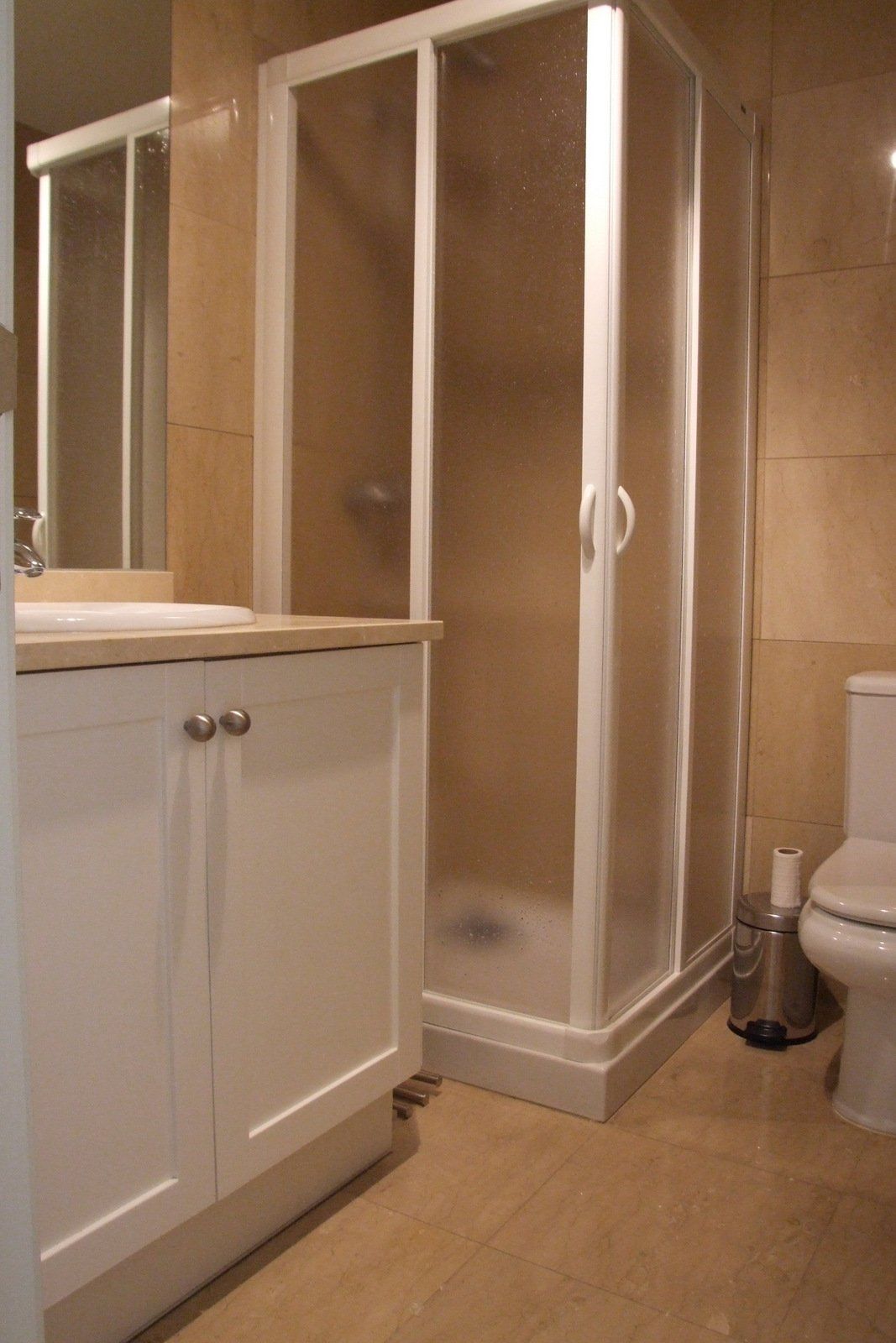 Douchekamer met douchecabine, muren volledig in marmer.